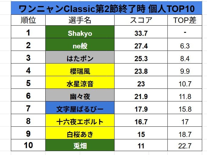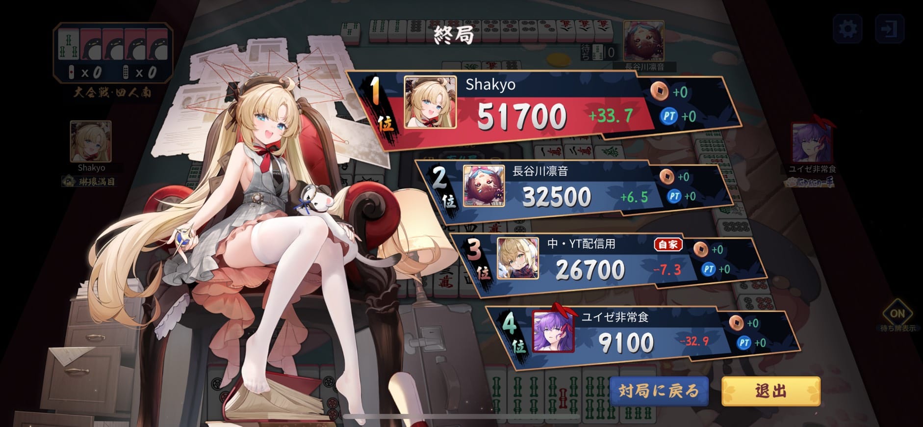 席順は起家から中・YT配信用選手(Fun Artifact)・ユイゼ非常食選手(ネ!コ!)・長谷川凛音選手(Reincarnation)・shakyo選手(Wondeful Sky)。