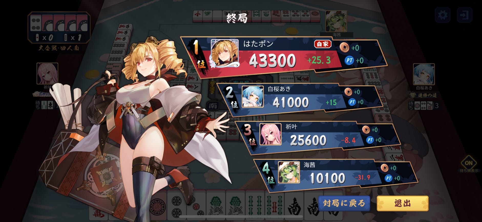 続く1本場は白桜あき選手が7700は8000をはたポン選手から出アガリ終局。