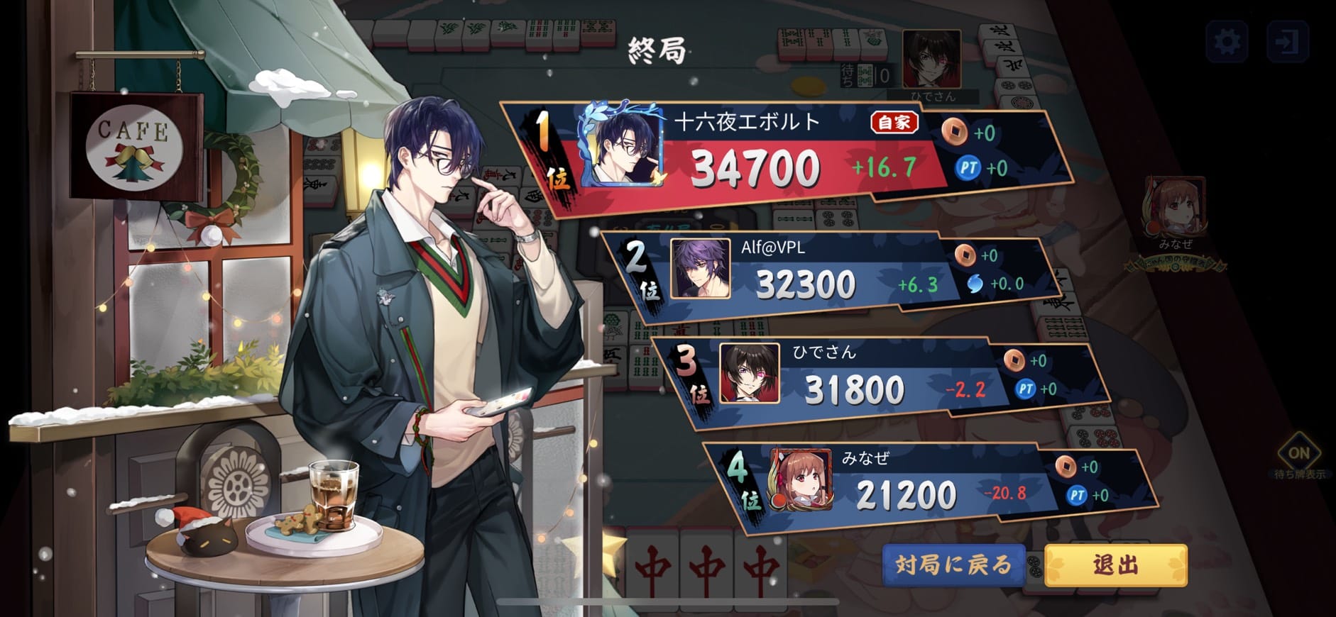 オーラス、Alf@VPL選手がひでさん選手から4800を出アガリ連荘、1本場はひでさん選手がみなぜ選手から7700は8000を出アガリ終局。
